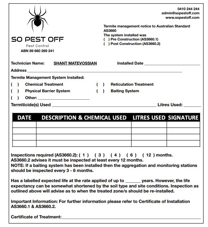 • A certificate detailing the installed termite management system